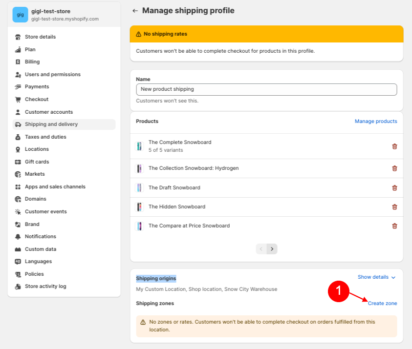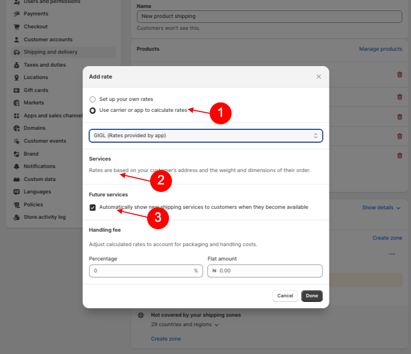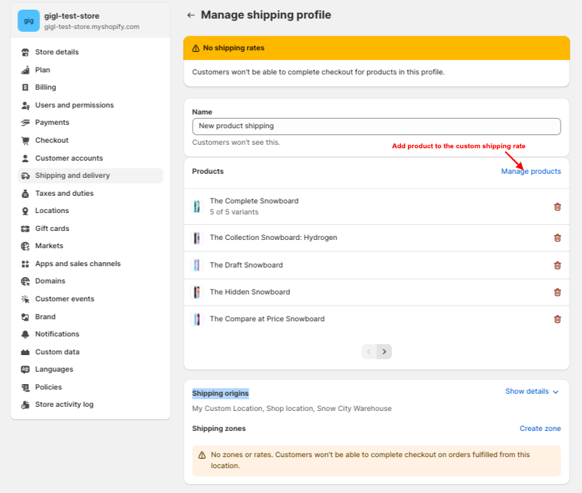 - If custom shipping rate, select and add appropiate product to the custom shipping rate then save